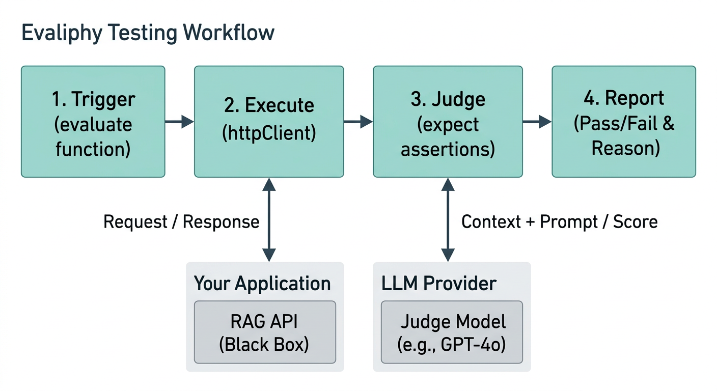 Evaliphy is designed to bring the rigor of traditional software testing to the non-deterministic world of RAG applications. It operates as a bridge between your running application and a highly capable LLM "Judge" that evaluates the quality of your system's outputs.